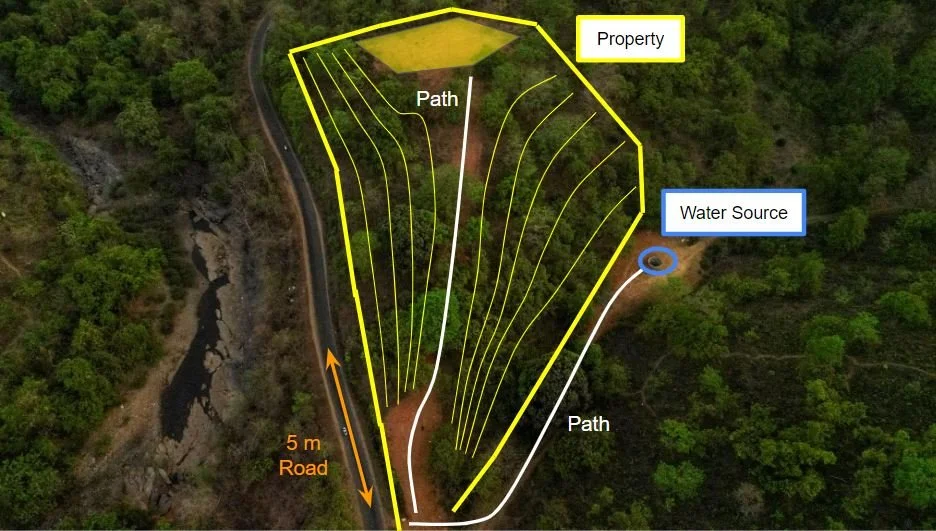 Analysis of a plot of land indicating source of water, slope and accessibility.